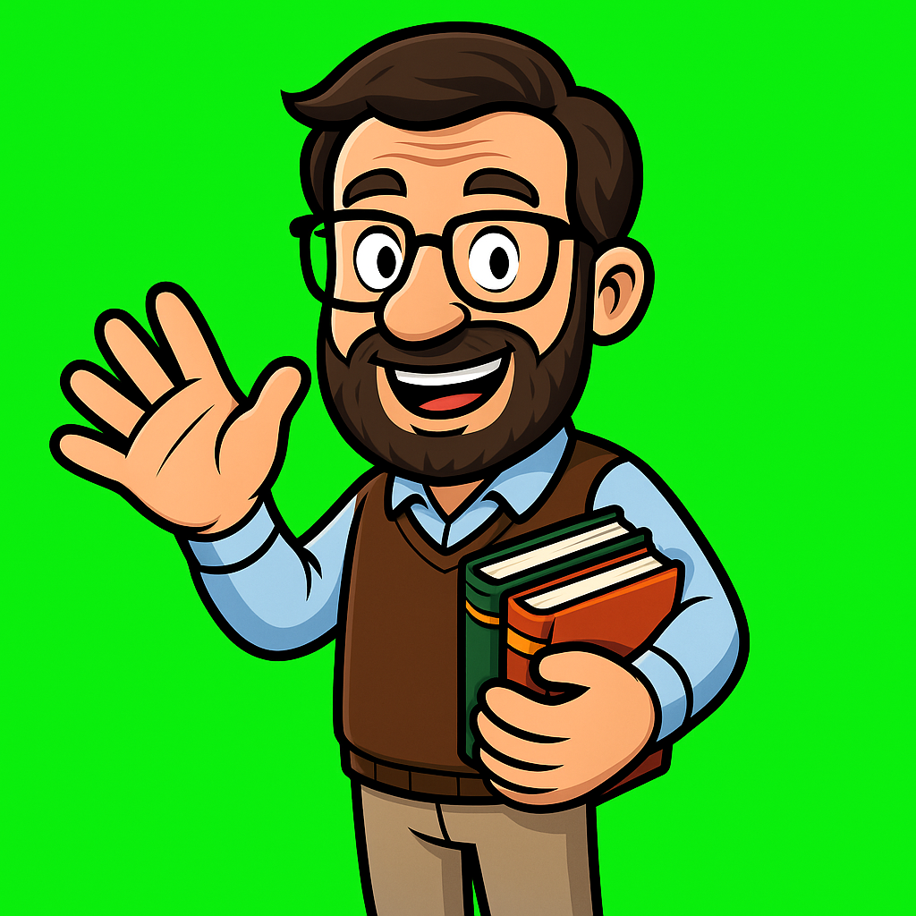 Caricatura divertida em estilo cartoon vetorial de um professor sorridente com óculos e livros na mão...